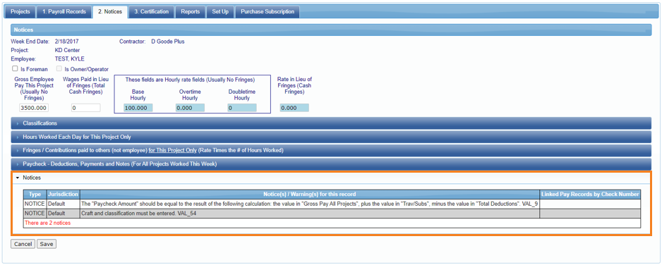 Based on Data Completeness, any missing information will cause payroll records to show under the 2. Notices navigation tab. E.g., blank hourly rate of pay; hourly overtime (if overtime hours reported); blank gross pay all projects or paycheck amount (net pay) etc.