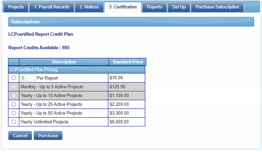 When the Purchase Reports or Subscription option is selected, choose the subscription desired and select Purchase. A new window will appear for company and credit card information.