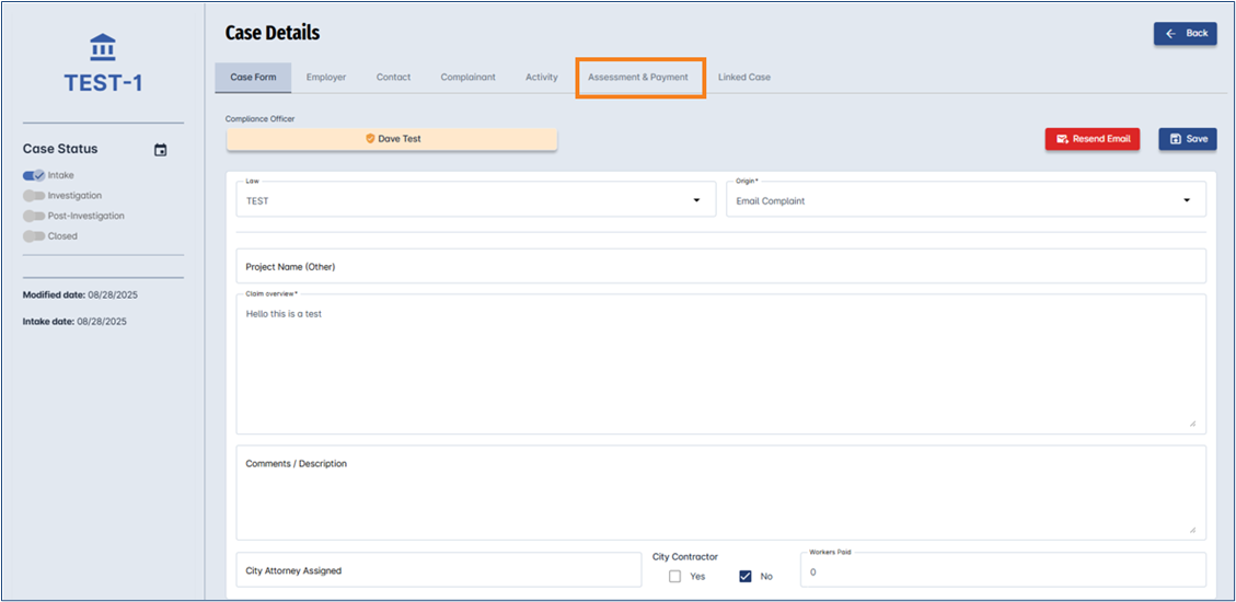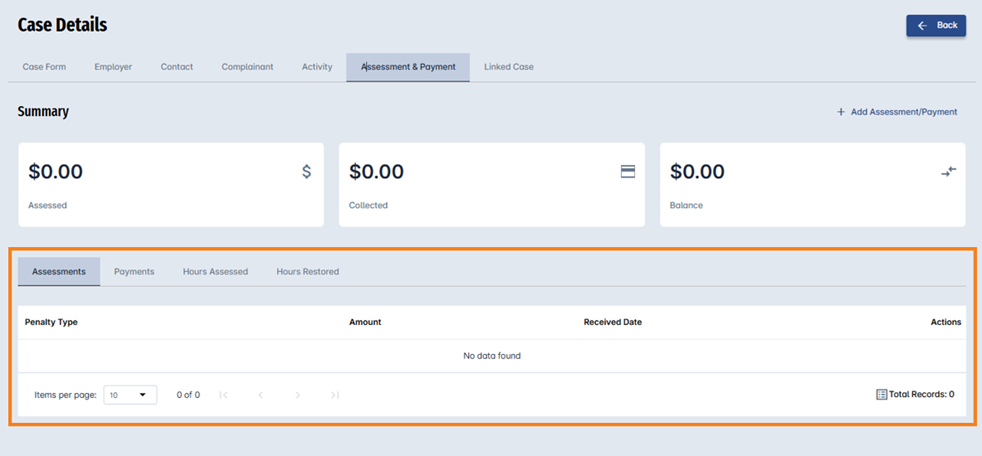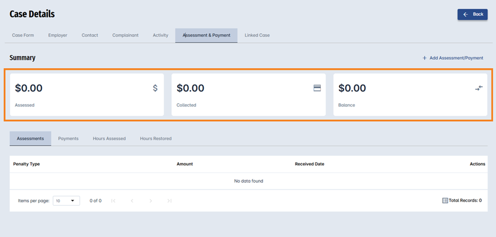 Once inside the section, a compact dashboard will display, featuring three main categories that provide an overview of the Assessments and Payments for the selected case. These categories display the Assessed, Collected, and Balance amounts. When an assessment is created, the user must specify the type of penalty being assessed and the amount the employer is required to pay.