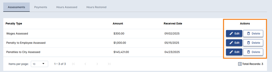 A list is also displayed, which varies depending on the type of Assessment or Payment added to the current case. This list can be filtered using a sub-navigation bar that includes all available Penalty Types, and it also supports pagination to easily browse through multiple items.
