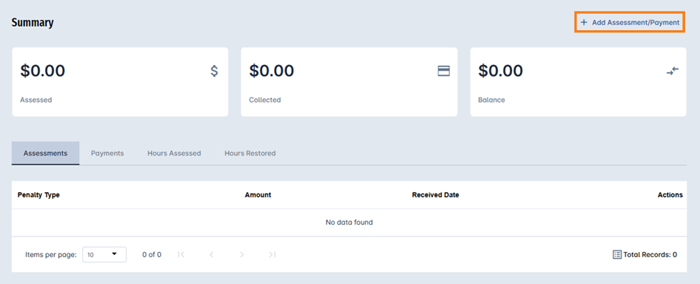 To add an Assessment or Payment, click the button Add Assessment/Payment located in the top-right corner of the section. This action will take the user to the corresponding form to add a new activity record.