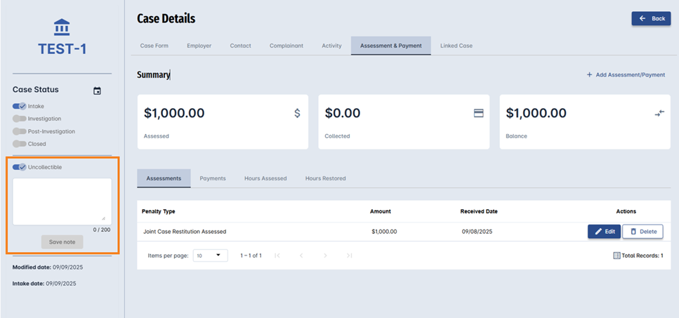 Once an Assessment is created, it will appear in the list, and the Case Status bar will update, reflecting that the case now has a balance different from $0.00. As a result, the status will be marked as ‘Uncollectible’, and if the case is later moved to a Closed status, a justification note will be required.