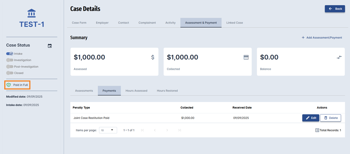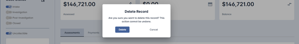To remove an Assessment/Payment from the current case, click the Delete action in the list within the section.