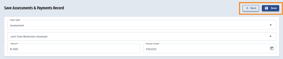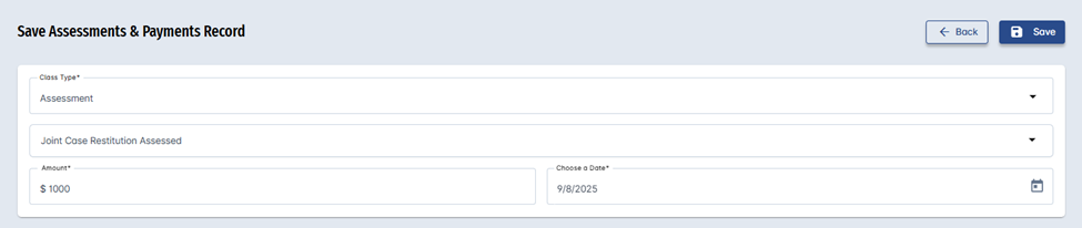 Upon selecting Add Assessment/Payment, a form will be displayed where all relevant information about the Assessment/Payment can be entered. All fields are required; if these fields are left blank, the record cannot be created.