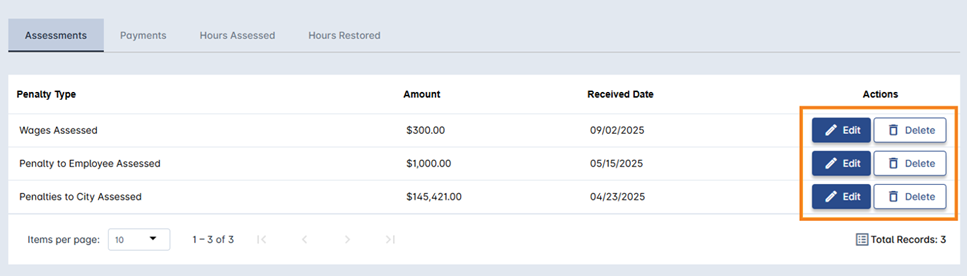 To edit a Payment/Assessment Record, click the Edit button located on the specific record you want to modify. A form will then appear displaying all the editable fields. You can make the necessary changes and save the updated information.