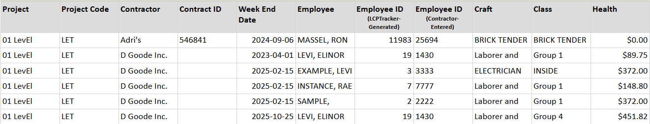 Descripción del Informe: este informe proporciona un desglose de los empleados individuales para la fecha de fin de semana que especifique, por proyecto y por contratista. Muestra la siguiente información: