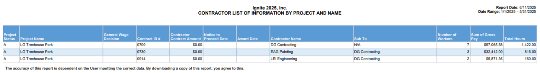 Este informe extrae un resumen de cada contratista que trabaja en un proyecto e incluye lo siguiente: