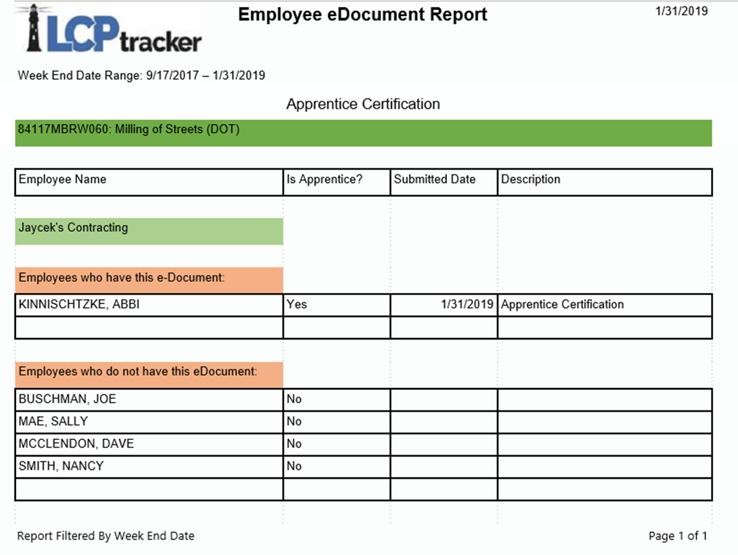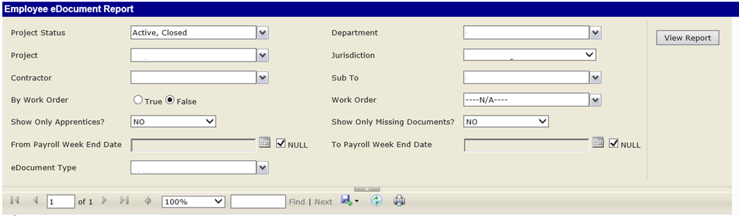 Descripción del Informe: este informe muestra si falta un eDocument y aún no ha sido enviado para un empleado. Puede elegir mostrar únicamente aprendices y/o aquellos empleados que no tienen un eDocument. El informe se ejecutará por contratista y proporcionará los nombres de los empleados que no tienen el tipo específico de document electrónico seleccionado. La fecha de fin de semana de nómina se establecerá por defecto en Null, lo que incluirá fechas desde que se envió el primer eDocument hasta la fecha actual.