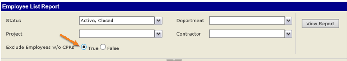 El filtro de proyecto reducirá la selección de contratistas y excluirá a los empleados que no estén en un CPR si se selecciona “True”. Para mostrar todos los empleados ingresados por el contratista, mantenga el filtro como “False”.