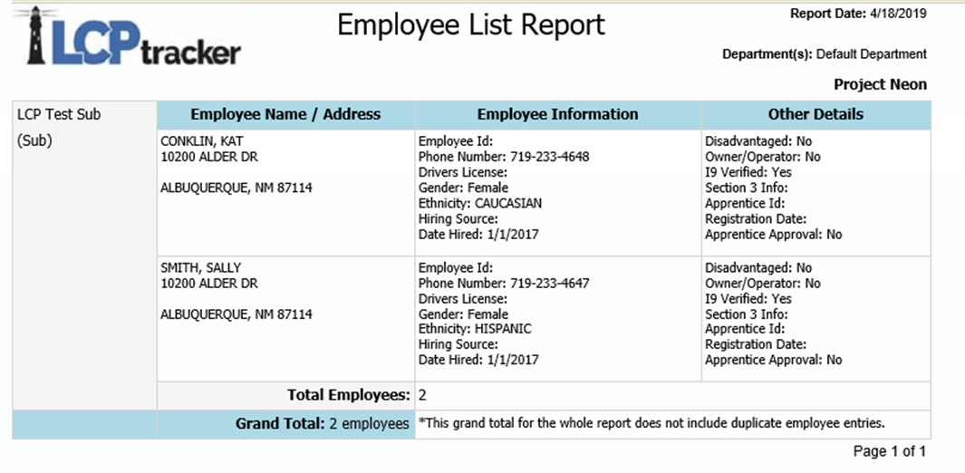 Descripción del Informe: este informe muestra la información del empleado, incluyendo los siguientes datos que han sido configurados en la cuenta del contratista seleccionado: