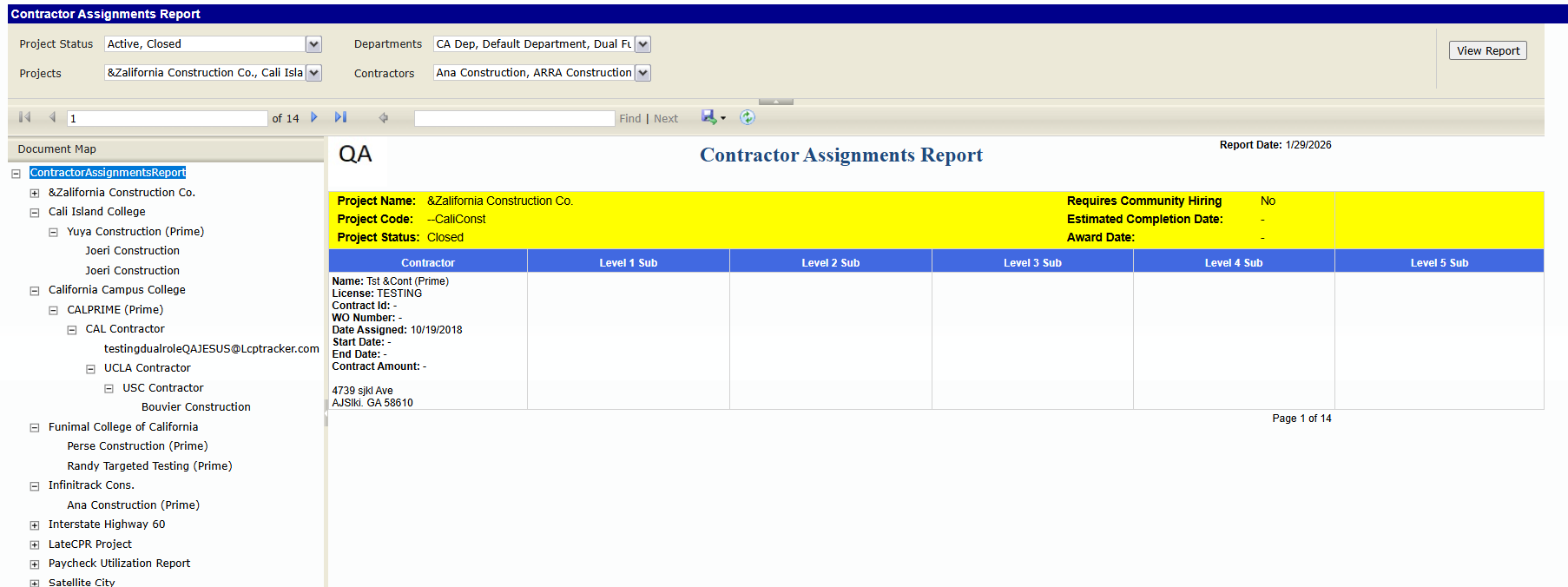 Se ha creado un nuevo Informe de Asignaciones de Contratistas para las nuevas bases de datos que ahora utilizan la nueva función Contractor Tree View, la cual es activada por un LCPtracker Customer Success Manager. Si esta función está activada, verá el siguiente nuevo informe en su base de datos en lugar del informe mencionado anteriormente.