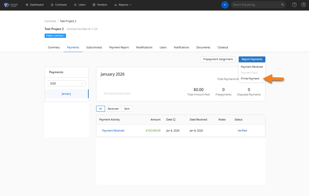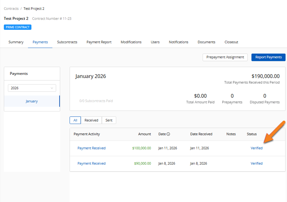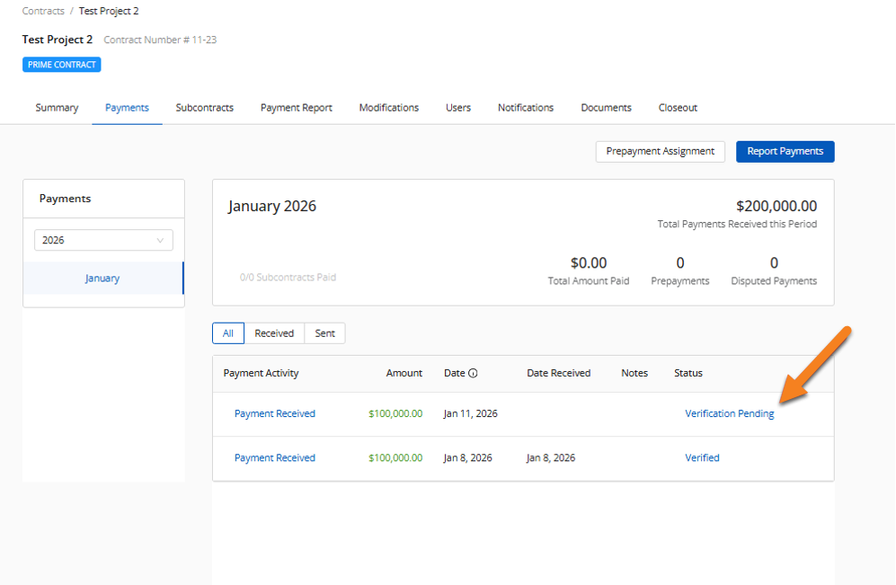 The contractor will then receive a notification with the payment report, where they will have to verify the payment amount. After the payment has been verified, the status will update to reflect verification.