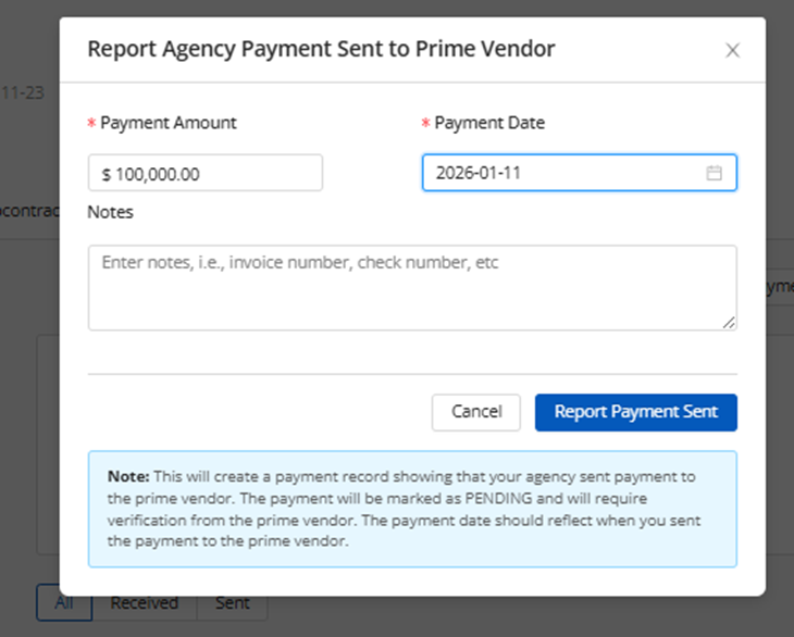 After selecting Prime Payment, the following section will appear, where you will be able to report the amount of payment being reported along with the payment date. You will be able to add notes if needed as well.
