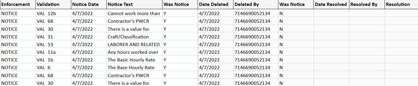Nota: Para mostrar avisos resueltos o eliminados, asegúrate de marcar “Show Resolved/Deleted Notices” como True. Un aviso eliminado aparecerá si el contratista corrigió el problema antes de certificar la nómina, ó si el Admin eliminó el aviso durante su revisión de cumplimiento.