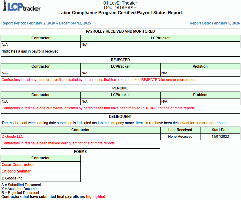 Payrolls Received and Monitored: lista todos los contratistas que enviaron CPRs junto con cada fecha de Fin de Semana dentro del rango ingresado. La fecha Fin de Semana del CPR tendrá un asterisco (*) si el siguiente CPR para la siguiente fecha Fin de Semana no existe, o si el CPR no cae dentro del rango de fechas ingresado. Si Prime Approver está habilitado, aparecerá un asterisco si el siguiente CPR no ha sido aprobado por un prime approver. Un CPR debe estar aprobado por el Prime Approver y dentro del rango para aparecer en el informe.