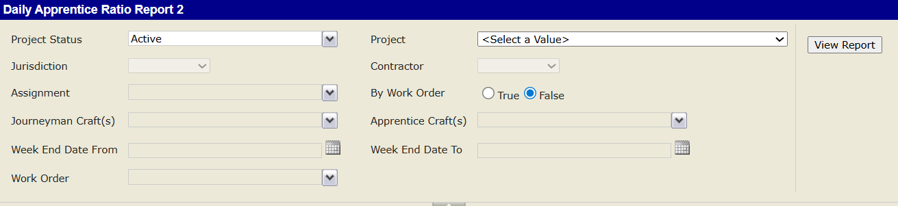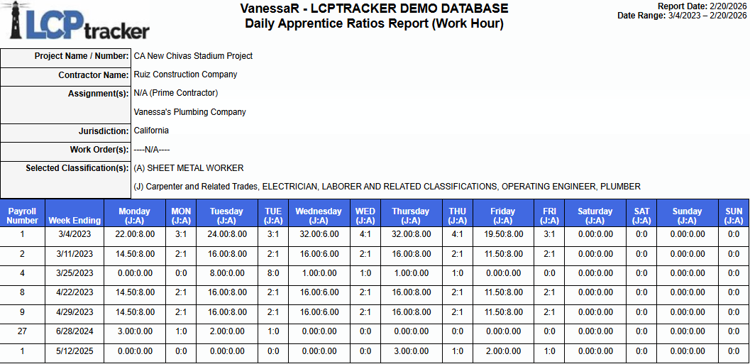 Descripción del informe: este informe proporciona un desglose diario de las horas de los aprendices en comparación con las horas de los oficiales (journeymen). Permite ver de un vistazo dichas proporciones. Contiene la siguiente información: