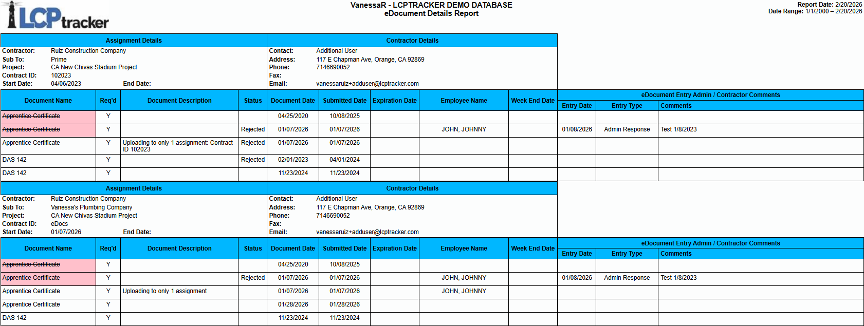 Descripción del informe: este informe muestra una lista y el detalle de todos los eDocuments cargados según los parámetros establecidos, incluyendo los eDocuments que fueron agregados y posteriormente eliminados. Estos eDocuments eliminados se muestran con una celda en rojo y con tachado en la columna Document Name. El informe proporciona los siguientes detalles: