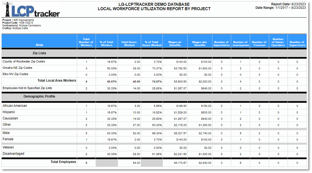 Descripción del Informe: este informe es una forma popular y sencilla de visualizar la utilización de trabajadores en su proyecto, por código postal y/o por las demografías seleccionadas, de un solo vistazo. Contiene la siguiente información: