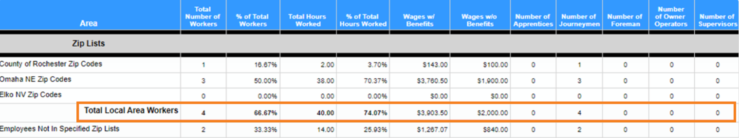 Diferencia entre el informe original y el informe #2: el Informe de Utilización de Trabajadores Locales del Proyecto #2 subtotaliza a todos los trabajadores del área local combinados, mientras que el informe original solo proporciona los totales por lista de códigos postales sin la resumida adicional.