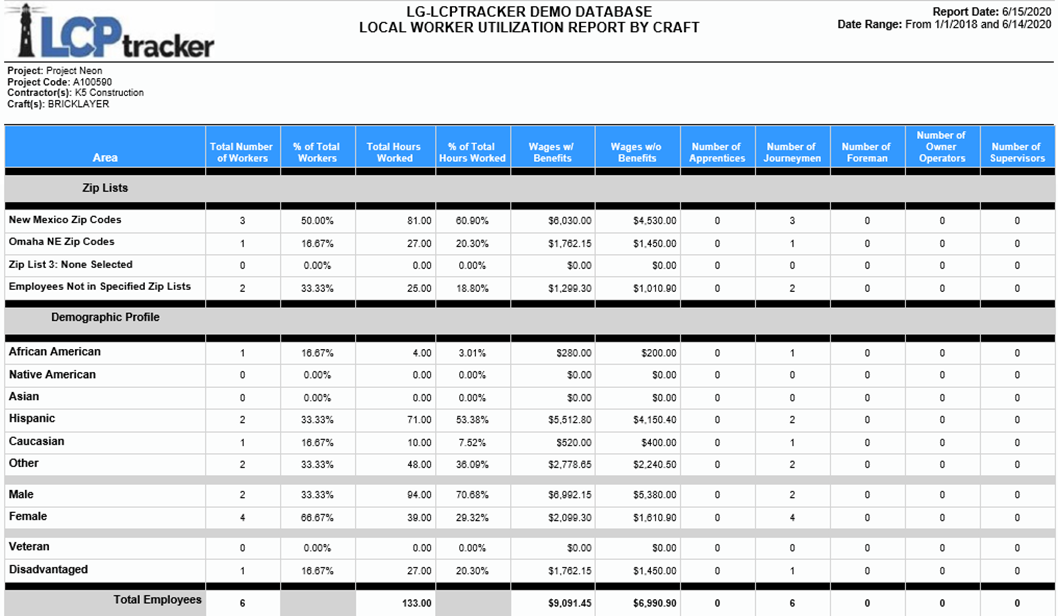 - Total de horas trabajadas, por lista de códigos postales, por demografías.