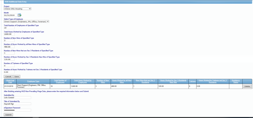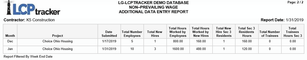 Descripción del Informe: este informe muestra información correspondiente a contratistas que no están sujetos a salarios prevalecientes (non-prevailing wage contractors). Está diseñado para que los contratistas reporten a sus empleados que no reciben salarios prevalecientes. El informe extrae datos de la sección del contratista denominada HUD Additional Data Entry Section para completar su contenido. Incluye la siguiente información: