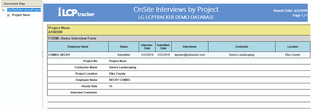 Descripción del Informe: este informe agrupa los datos ingresados en los OnSite Forms por PROJECT. Esto significa que, si el usuario ejecuta el informe para múltiples formularios, el informe se dividirá en secciones basadas en los proyectos sobre los cuales reportan los formularios. Cualquier campo que haya sido rastreado se listará y se mostrará en el informe. El informe se divide por contratista, manteniendo juntos todos los formularios de un contratista específico: