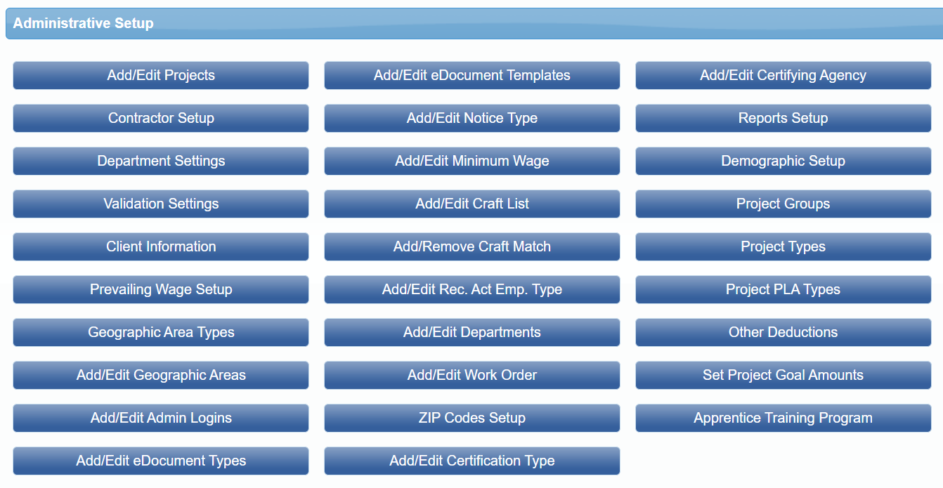 Some accounts within the State of California will have an Override Wage Data link (not shown) and may not see the Prevailing Wage Setup link (shown above in Full Admin view).